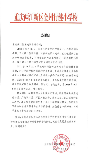 4月10日,兩江建設公司收到了一封來自業(yè)主單位金州小學發(fā)來的感謝信。
