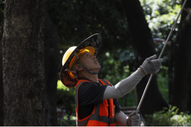 10:16,另一棟樓的天臺(tái),經(jīng)過連日的高溫烘烤,難得的庇蔭處也燥熱難耐。安全監(jiān)督員小陳仔細(xì)檢查每一條承重吊繩的卡扣是否牢固,反復(fù)測(cè)試安全鎖的鎖止力度。他介紹到,“高溫會(huì)加速金屬部件氧化,每一個(gè)卡扣都可能成為生命線的關(guān)鍵節(jié)點(diǎn)。”不遠(yuǎn)處,老趙踩著木梯微微前傾,將電鎬穩(wěn)穩(wěn)遞向空中,小費(fèi)伸手接過時(shí),手柄上早已覆上一層細(xì)密的汗珠。兩人的目光在高差中交換,像是完成了一個(gè)無需言說的暗號(hào)。全員互道“就緒”的話音剛落,“蜘蛛人”小分隊(duì)便抓牢繩索,伴著輕微的滑輪轉(zhuǎn)動(dòng)聲緩緩下降,正式開啟他們今天的第二輪作業(yè)。